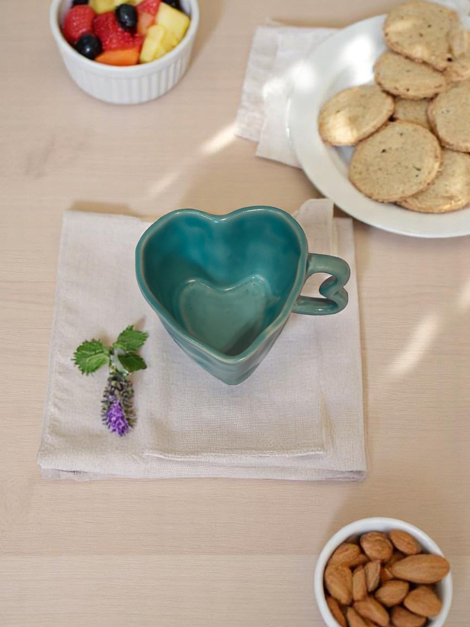Pour some love into your morning with this charming, handmade ceramic mug. Uniquely crafted in the shape of a heart, this mug features a stunning, glossy teal glaze that catches the light beautifully. The innovative design adds a romantic and whimsical touch to your kitchen, making it the perfect vessel for your favorite coffee, tea, or hot cocoa. It's a delightful gift for a loved one or a special treat for yourself.